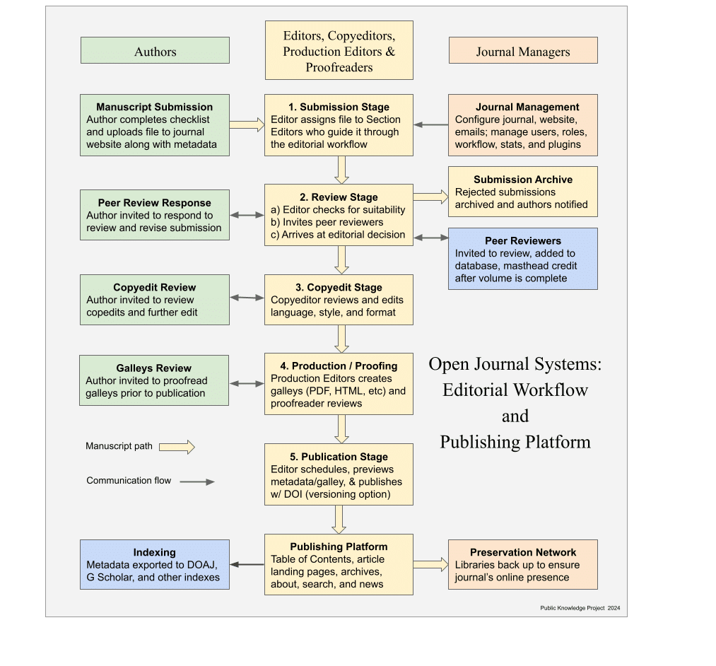 Nota: De Open Journal Systems, por Public Knowledge Project, s.f.-c (https://pkp.sfu.ca/wp-content/uploads/2024/06/OJS-Workflow-and-Platform-2024.png)